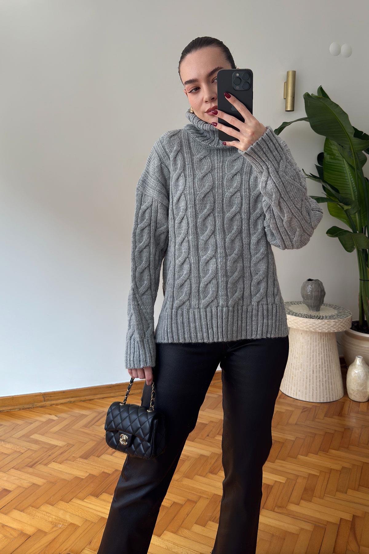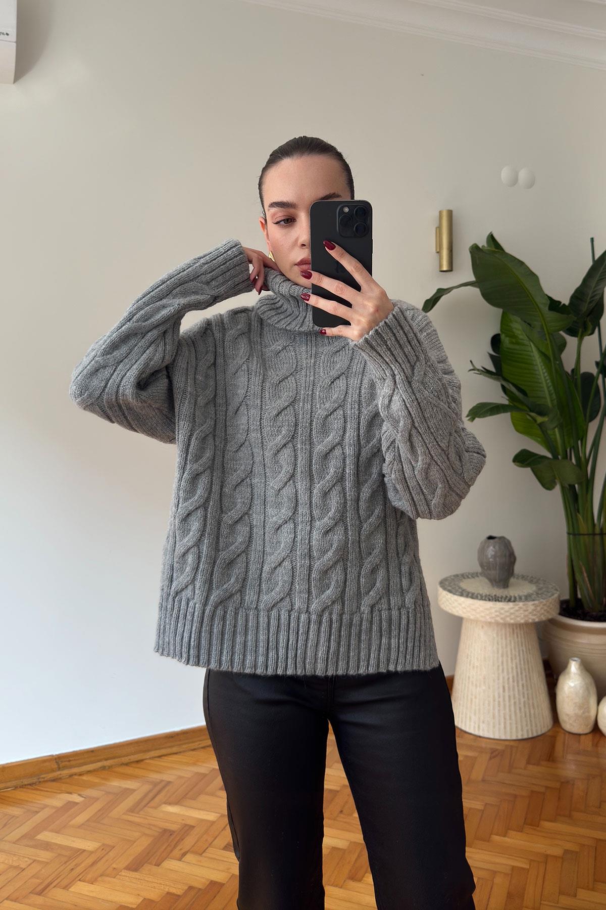 Boğazlı Saç Örgülü İthal Triko Kazak- GRİ (JE1011-105)