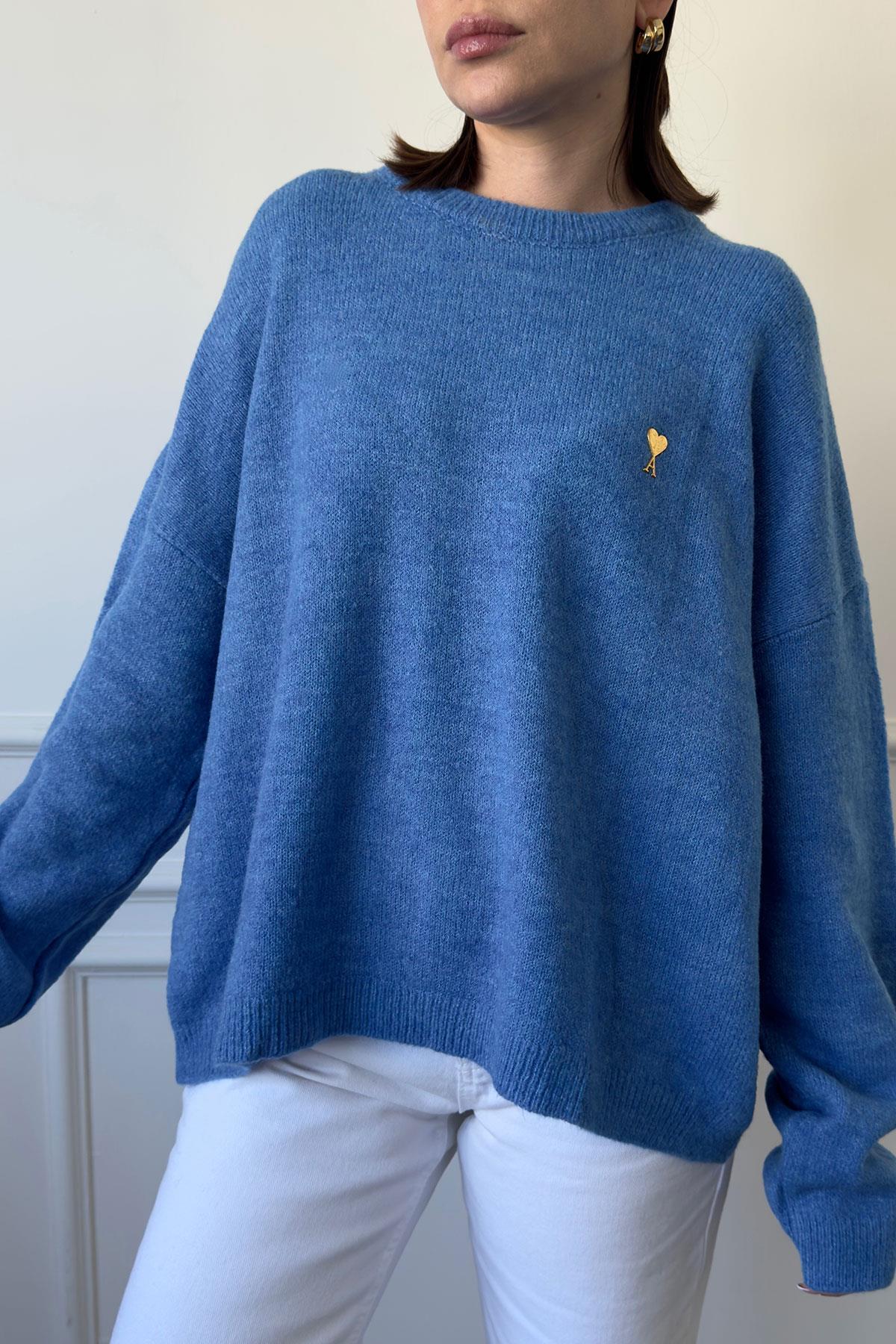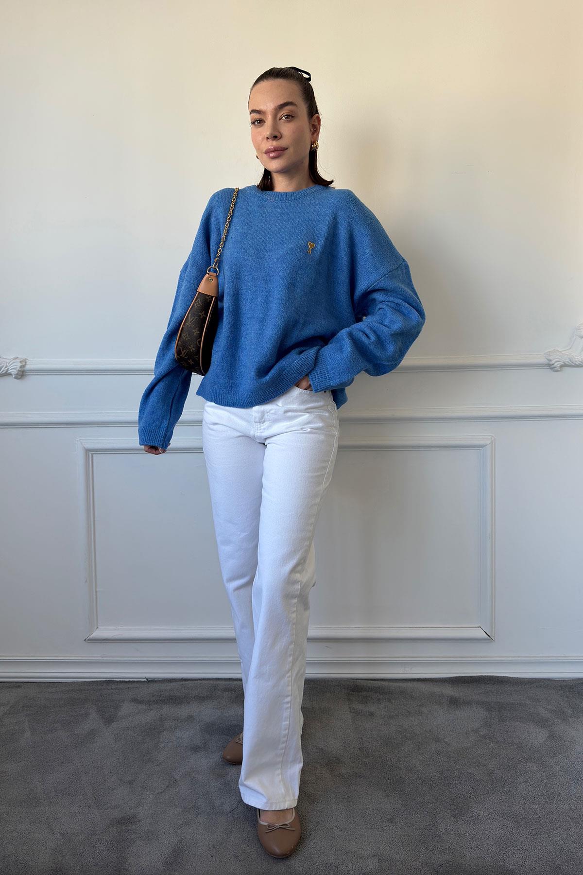 Duble Yaka Kalp Broşlu Triko Kazak- MAVİ (QUTK251084-107)