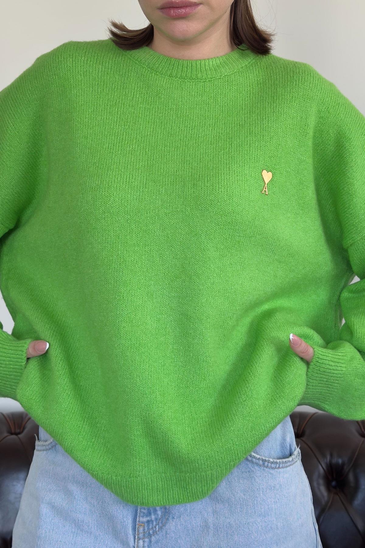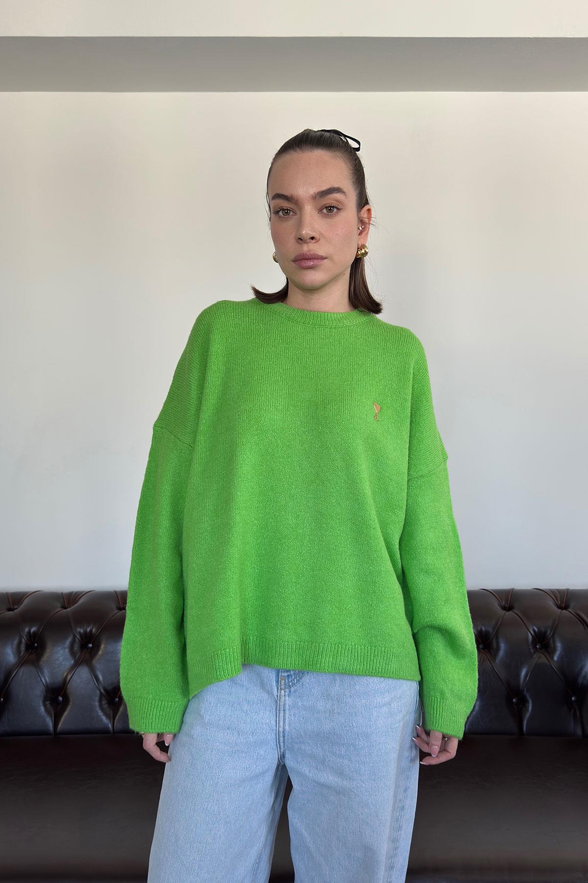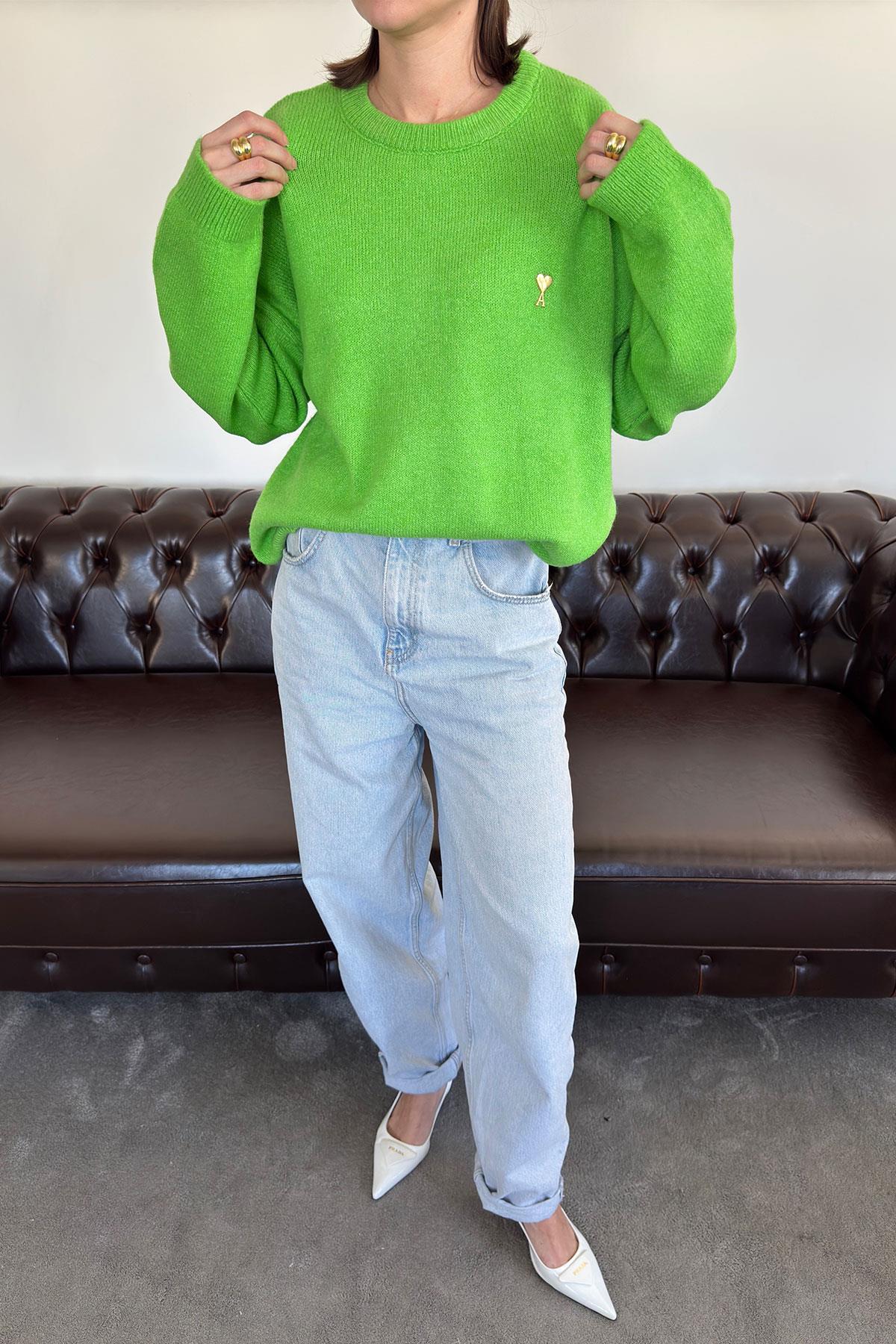Duble Yaka Kalp Broşlu Triko Kazak- YEŞİL (QUTK251084-101)