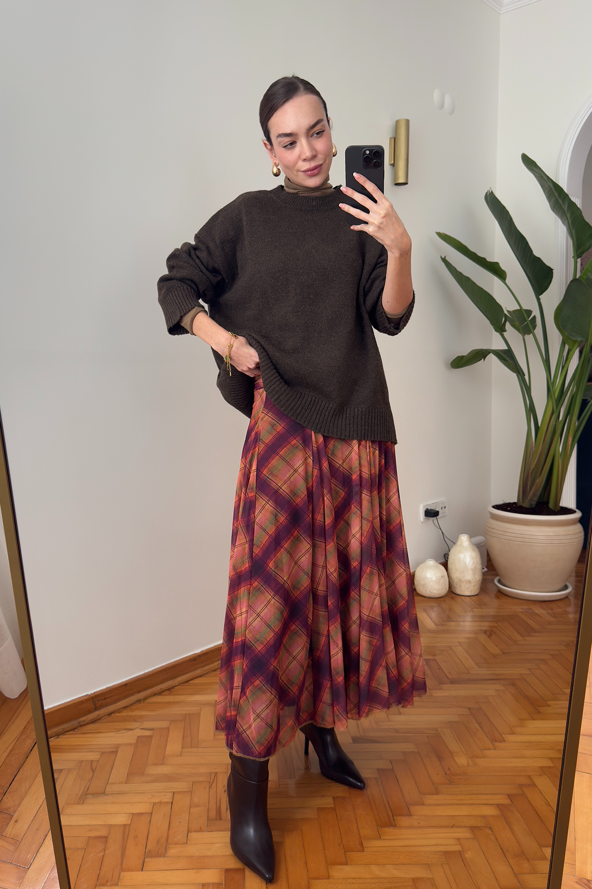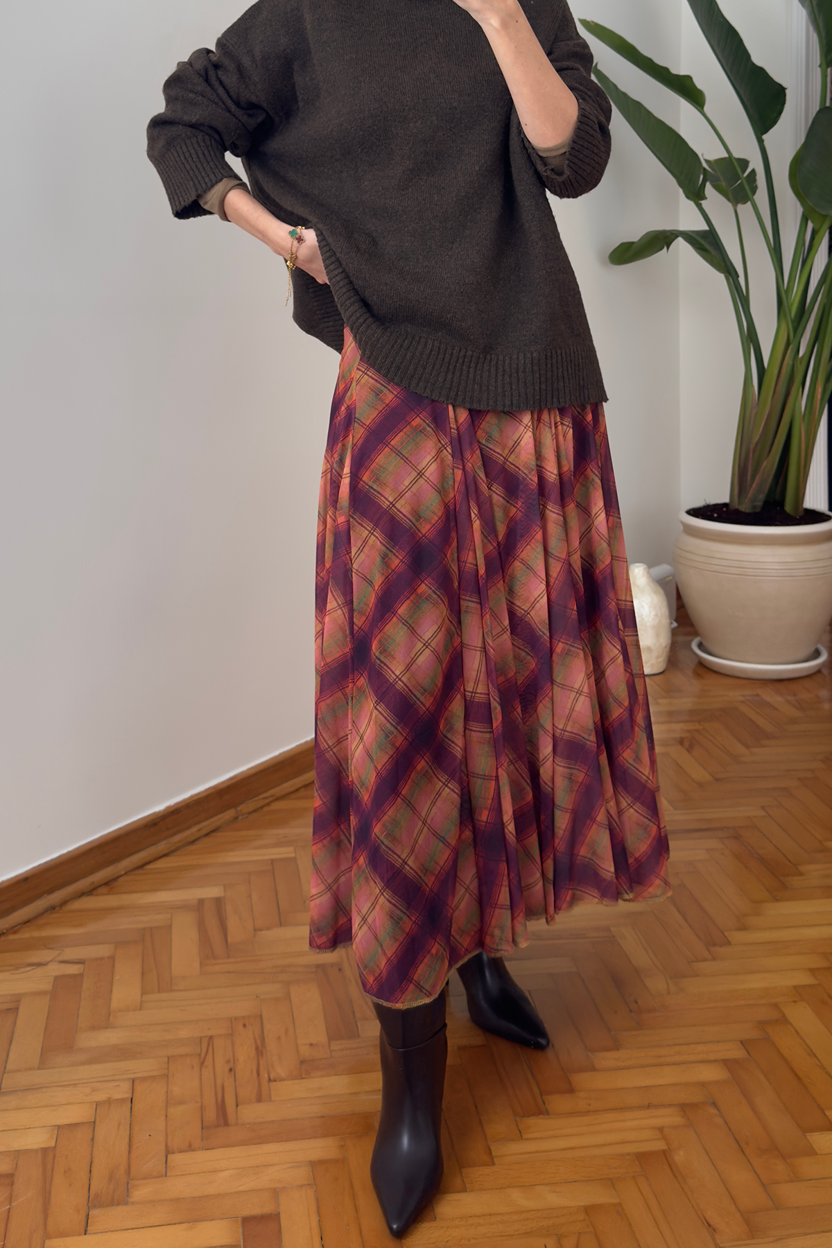 Ekose Desen Renklii Şifon Tasarım Etek- ORANGE (NM2551-135)