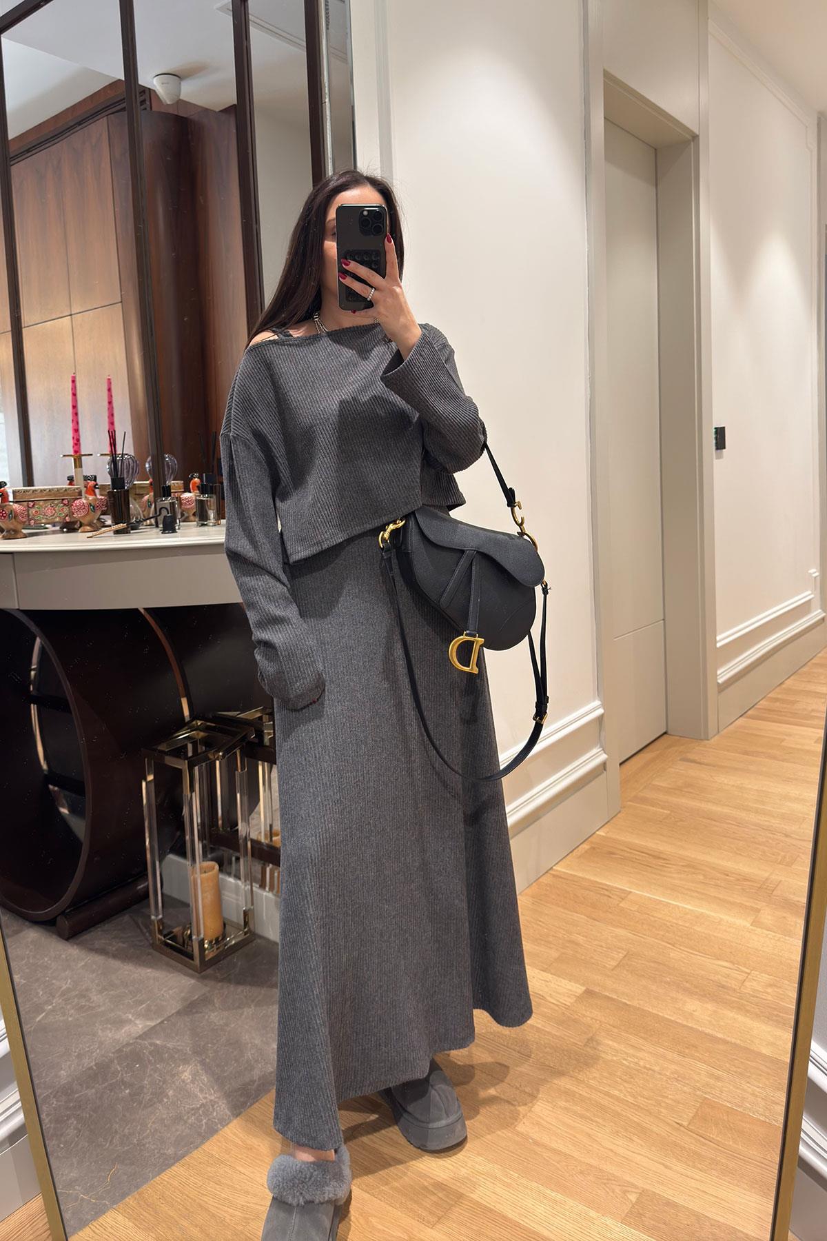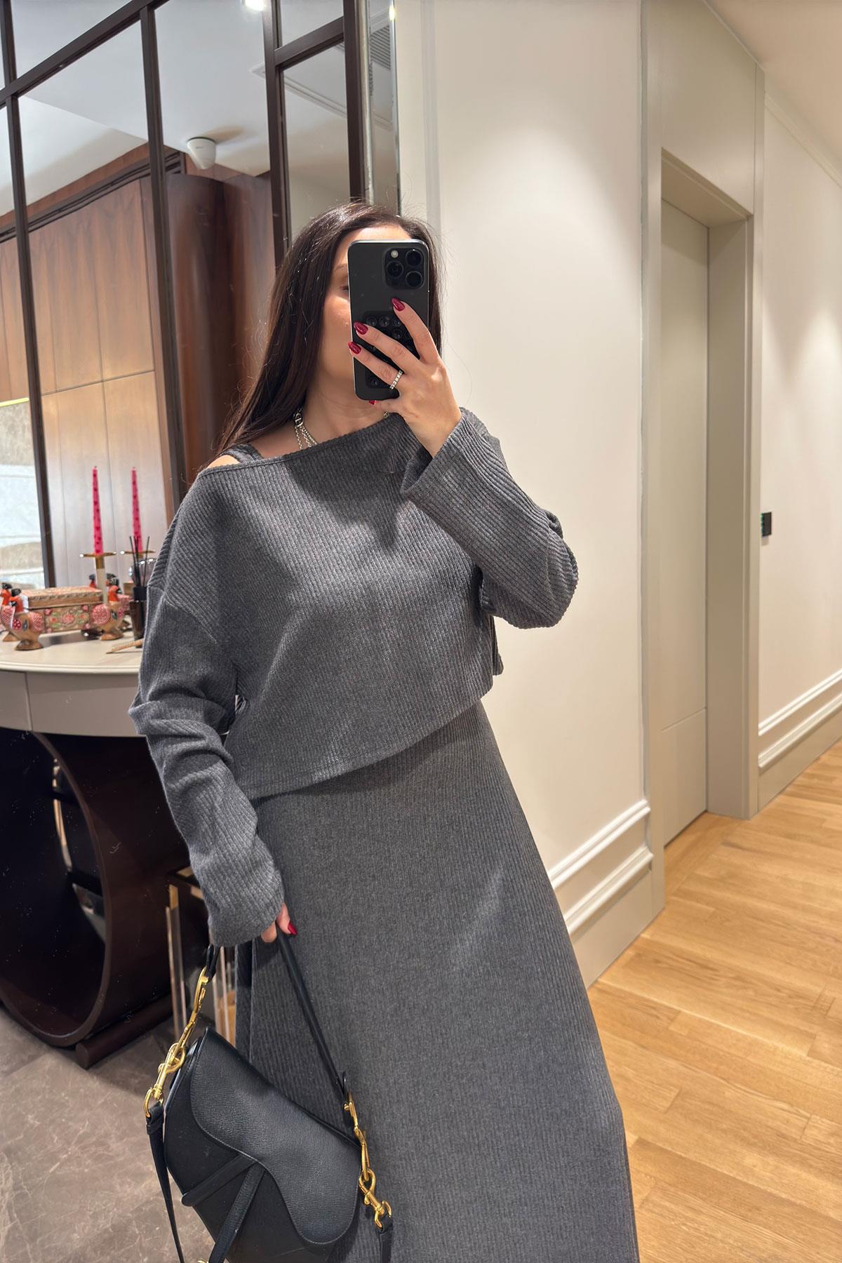 Kloş Askılı Örme Elbiseli Bluz Takım- ANTRASİT (FC7721-146)