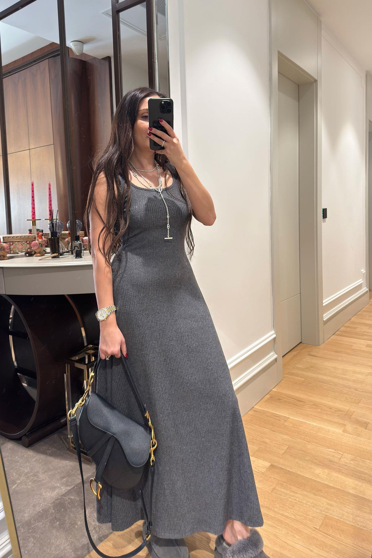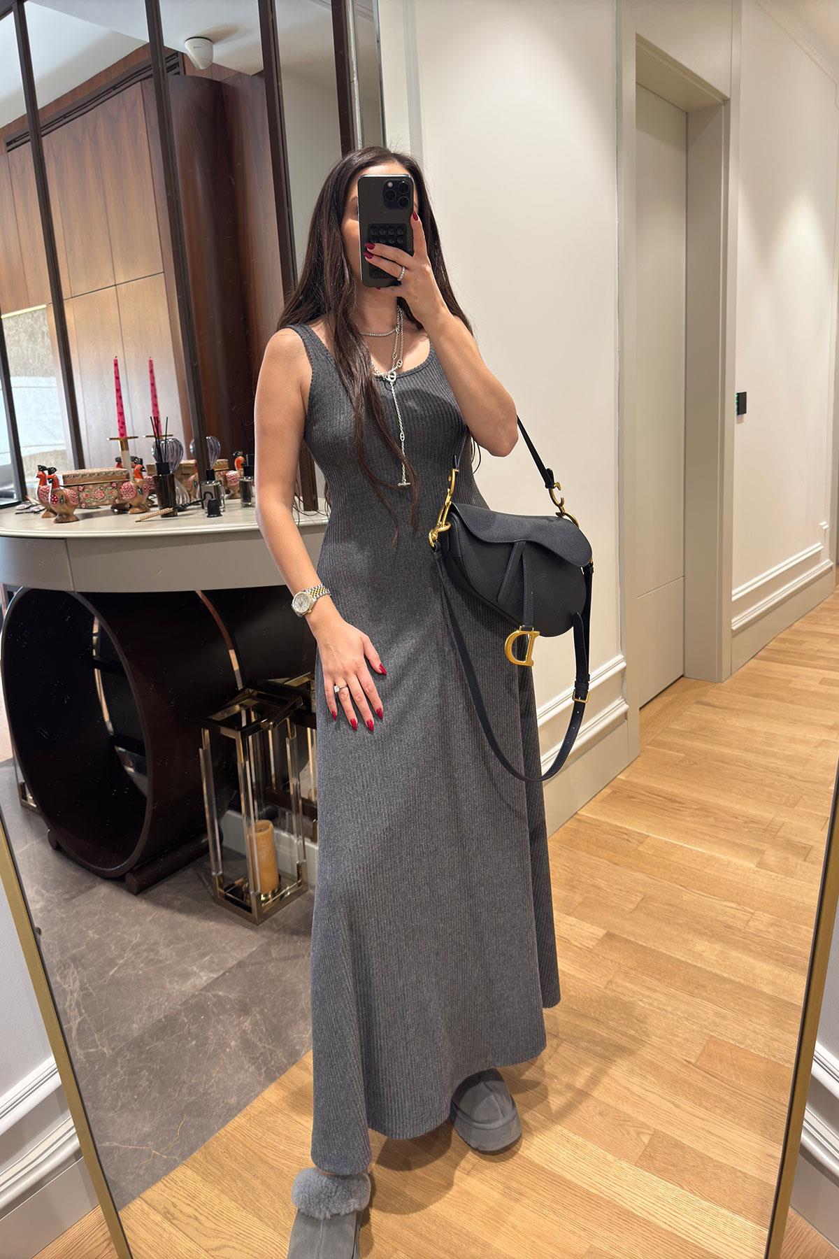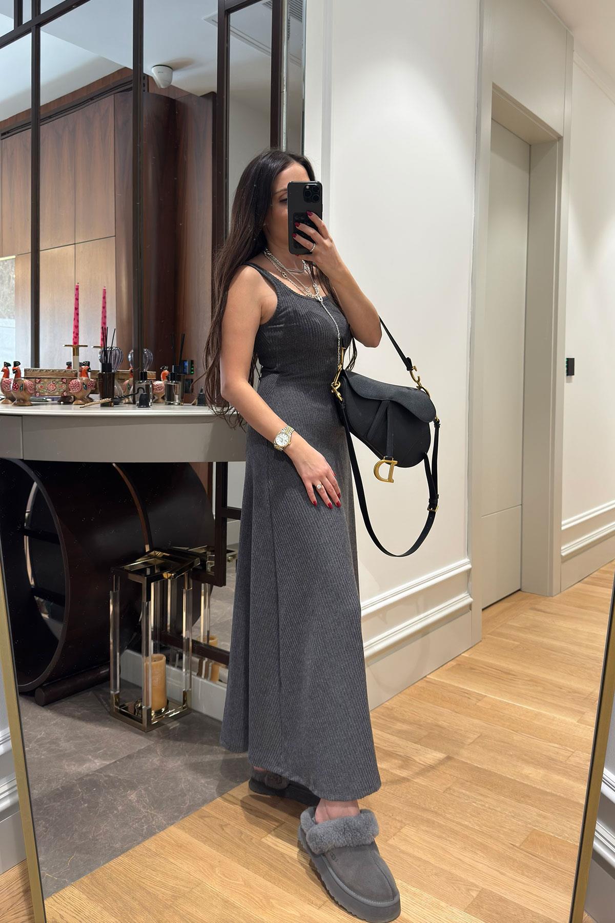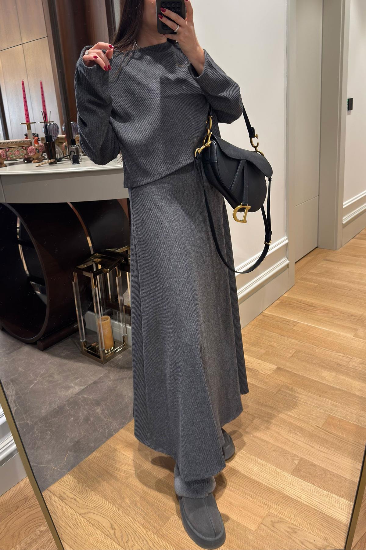 Kloş Askılı Örme Elbiseli Bluz Takım- KAHVERENGİ Kloş Askılı Örme Elbiseli Bluz Takım- ANTRASİT